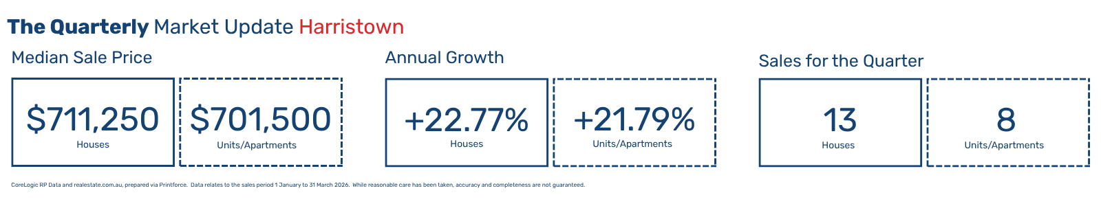 For buyers, it offers practicality, position, and a broad mix of housing. For sellers, it offers a suburb that continues to attract attention from families, investors, and value-focused buyers who want something well located and easy to live in. The latest quarterly figures show Harristown recorded a median house price of $711,250, annual house growth of 22.77%, 13 house sales for the quarter, and an average of 29 days on market. Units and apartments also performed strongly, with a median price of $701,500 and annual growth of 21.79%.